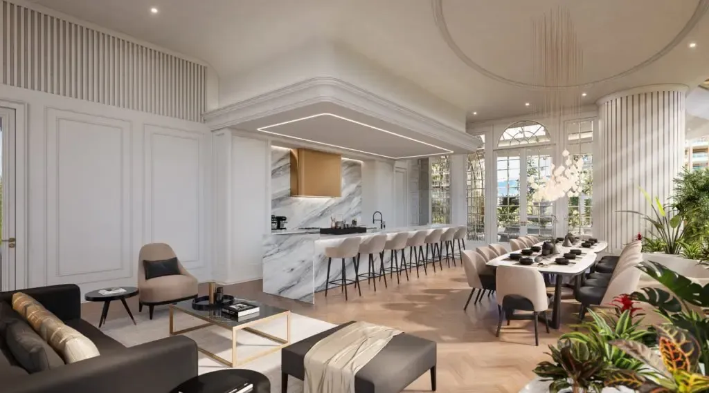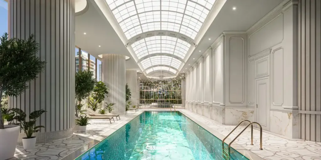 Greenhouse offers a wide range of homeowner amenities. Within the lower levels of the building, is approximately 14,000 sq ft of amenity space, including a lounge, party rooms, a communal kitchen, a karaoke & music room, a yoga studio, a gym, a games room, multi-purpose rooms, virtual golf, and a guest suite. The third floor features an indoor swimming pool with a partial glass bottom and ledge, a spa, an outdoor putting green, a deck, and a fitness zone. Outdoor amenities shared with rental tenants are a dog walking area, a children’s play space, and dining areas.